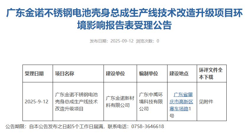 2025年9月12日,肇慶市生態(tài)環(huán)境局高新區(qū)分局受理廣東金諾不銹鋼電池殼身總成生產(chǎn)線技術(shù)改造升級(jí)項(xiàng)目環(huán)境影響報(bào)告表并對(duì)外進(jìn)行公告,公告期:5個(gè)工作日。